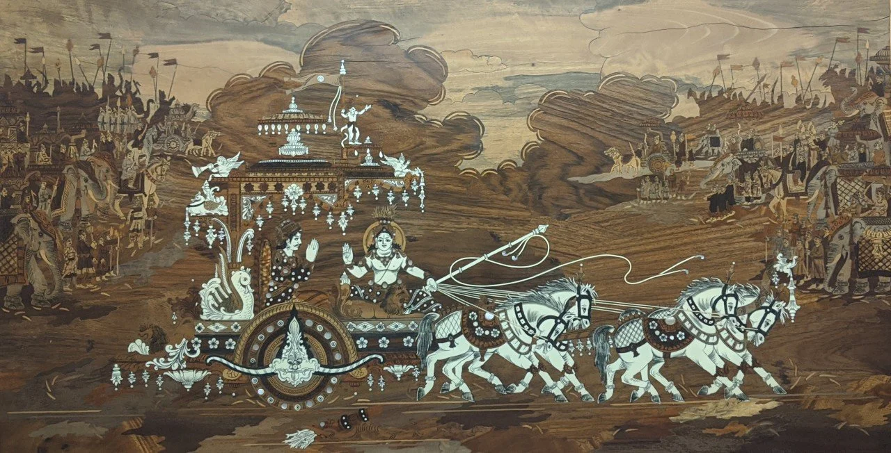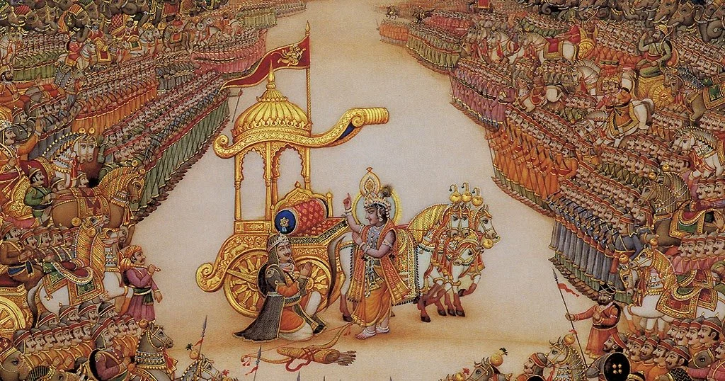 The Gītā is a dynamic dialogue between Arjuna (a noble warrior) and Krishna (the embodiment of awakened consciousness). Faced with an imminent battle against his own family, Arjuna is overwhelmed by doubt, fear, and confusion. Krishna offers Yoga as the path toward clarity, courage, devotion, and self-realization.